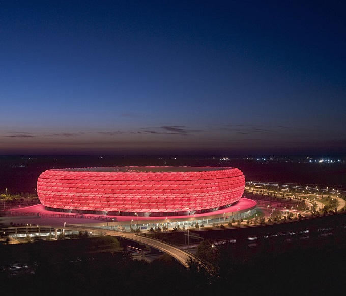 慕尼黑安聯球場(Allianz Arena)以它精巧的結構壯麗的外觀,成為慕尼黑以至于德國的榮耀。安聯體育場是歐洲最現代化的球場,外墻體由2874個ETFE膜結構氣墊構成,其中1056個在比賽中可以發光,當體育場中比賽的球隊發生變化時,墻的顏色就可以隨之改變,其奇妙之處將遠超想象。