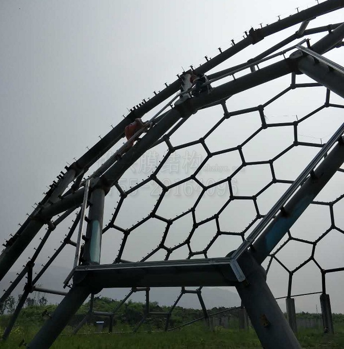 燁興連云港薔薇湖ETFE膜結構生態園項目,一期工程9416平方米,外形是三個連接在一起的半球空間,此次初裝膜的是1#球(直徑跨度60米)。