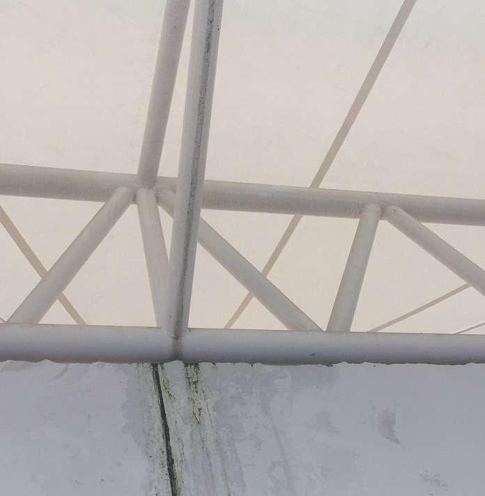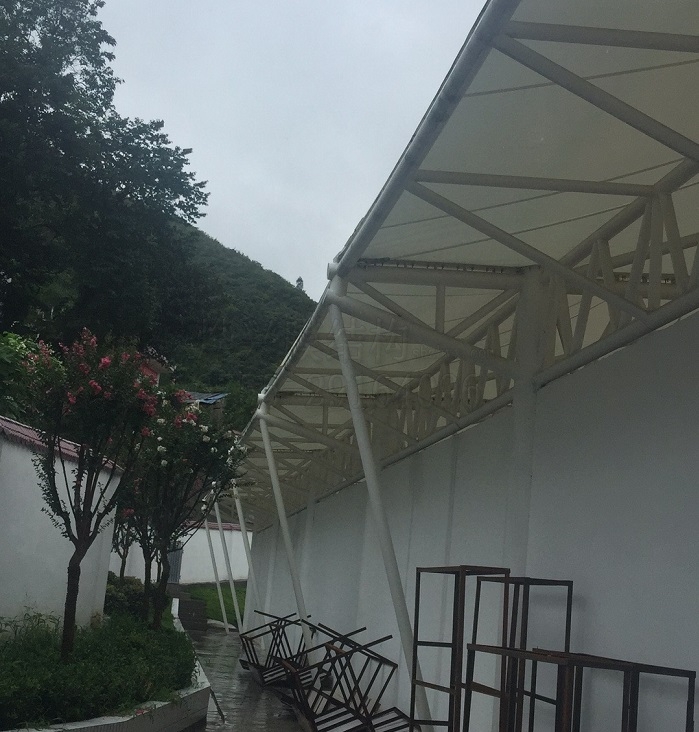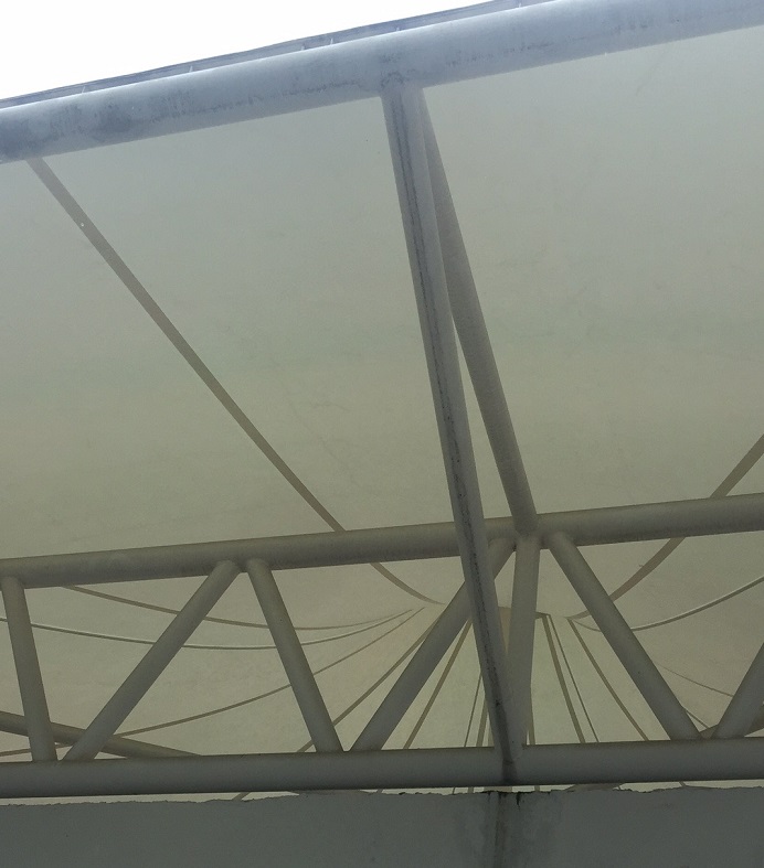 這里說(shuō)的漏水,不是膜材穿孔造成的滲漏,是雨水在膜布上匯流到邊緣,然后順著鋼結(jié)構(gòu)流入膜結(jié)構(gòu)內(nèi)部空間,使膜結(jié)構(gòu)的防雨效果大打折扣,長(zhǎng)期以往,會(huì)影響膜結(jié)構(gòu)的整體使用壽命。