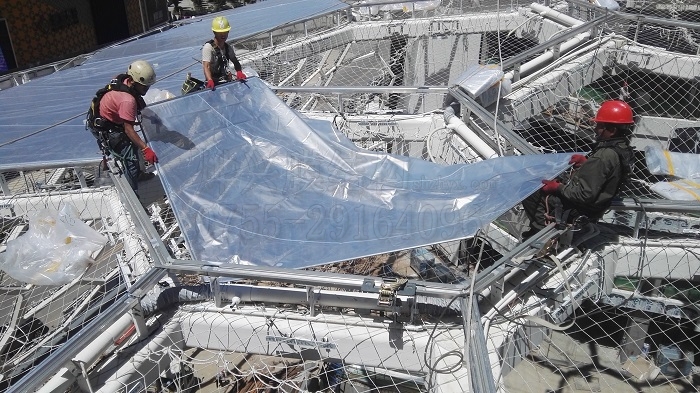 ETFE氣枕膜安裝時,先將膜材展開,多人配合將拉膜板串好,再對邊對號安裝
