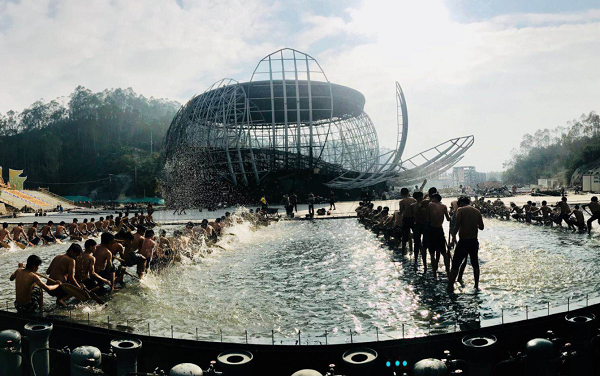 現場已經安排表演人員進行緊張排練,很佩服小伙子們大冬天赤著膀子在水里排練的敬業精神