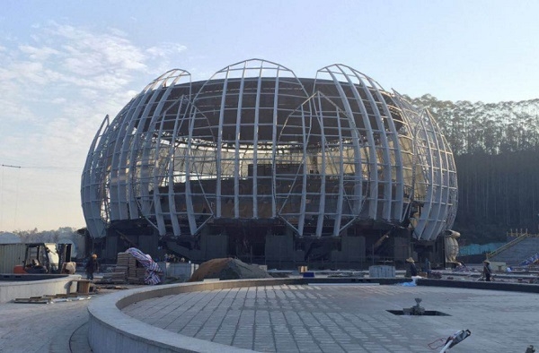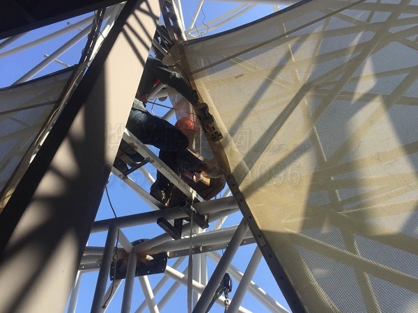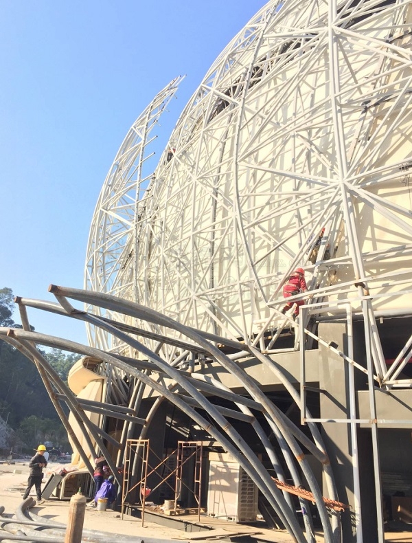 燁興云浮蓮花劇場PTFE膜結構項目已經進入最后的裝膜階段,但前期全國性降溫引發的雨雪天氣,對項目的工期造成了一定延誤,為了工程能在規定的時限內按時完工,目前公司將資源都暫時傾注,項目進入沖刺趕工階段。