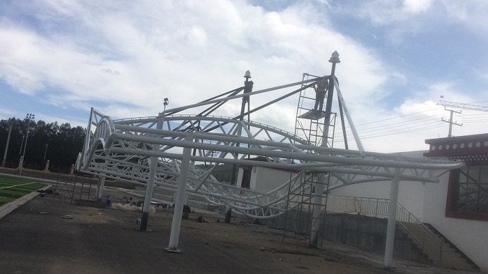 燁興-甘南體育看臺(tái)是深圳市燁興膜結(jié)構(gòu)工程有限公司為甘肅甘南州中等職業(yè)學(xué)校打造的膜結(jié)構(gòu)體育看臺(tái),項(xiàng)目設(shè)計(jì)、施工及相關(guān)材料服務(wù)都是由燁興膜結(jié)構(gòu)提供。目前,項(xiàng)目鋼結(jié)構(gòu)已經(jīng)在現(xiàn)場拼裝完成,正等待吊裝到位,然后進(jìn)行膜布張拉。