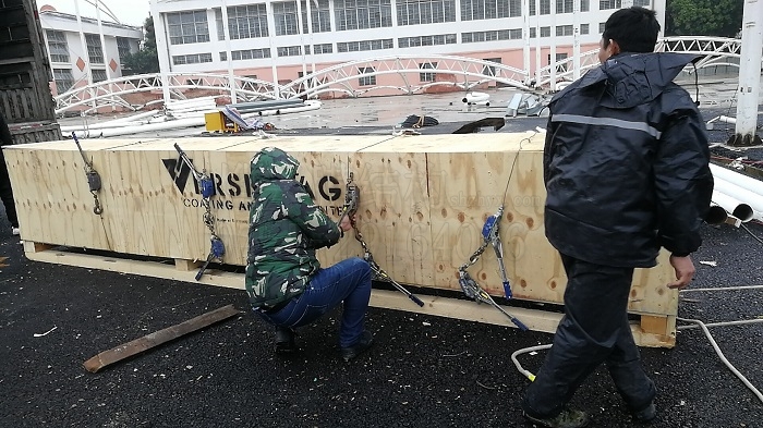 上圖的木頭打包箱中裝的即是本次進場的部分膜材。我們燁興膜結構追求完美品質,為了防止膜材在運輸過程中受到損壞,一般在將裁剪加工好的膜布用包裝材料包裹后,還要使用外箱運輸,這樣不但能更好保護膜材損壞及變形,現場工人也能從外箱的標識中迅速準確地了解膜材的對應編號及安裝位置。廣西大學網球場鋼膜結構工程,除鋼結構用料加工考究,使用的膜材也是行業內頂尖的杜肯PTFE膜材。這個膜材料比較特殊,主要用在使用年限25年以上的大型體育場館,所以各種質量標準都很高,尤其是抗拉強度非常好(7000N/5cm以上),張拉的時候一般要二次張拉才能到位,有經驗的老師傅才知道“緯向”張拉時,硬邊的夾具不宜使用平時常用的那種受力不均勻的夾具,否則容易把膜撕破。